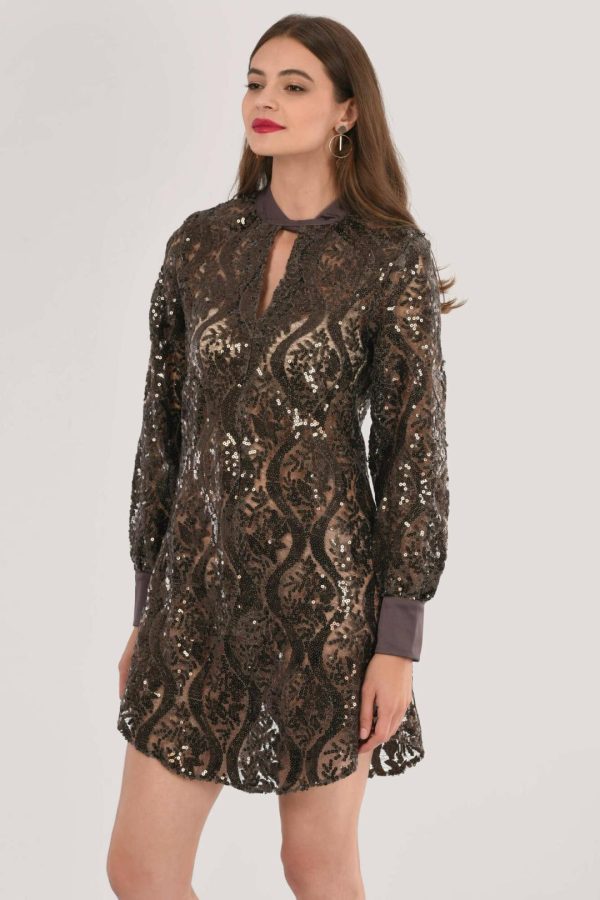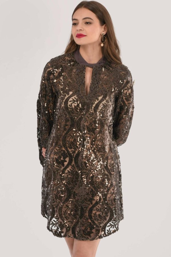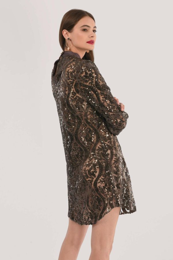 Sparkle the night away in this beautiful bronze sequin blouse. The high collar adds class and sophistication to this special number, which makes it the perfect option for an alternative to a dress this Christmas!